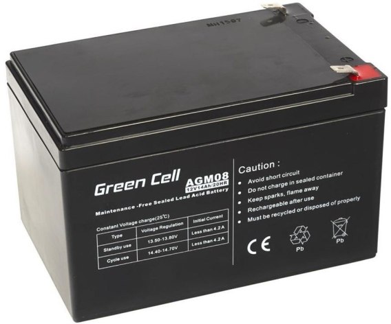 Akumulator żelowy o pojemności 14 Ah. Napięcie: 12 V. Żywotność: 5 lat. Technologia AGM VRLA. Konstrukcja uniemożliwiająca wyciek elektrolitu. Praca w każdej pozycji. Zabezpieczenie przed głębokim rozładowaniem; przeładowaniem oraz przeciwprzepięciowe.