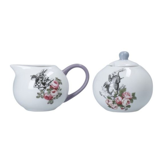 Cukiernica i dzbanuszek na mleko z zachwycającej swoimi walorami kolekcji Victoria & Albert. Piękne grafiki inspirowane ilustracjami „Alicji w Krainie Czarów", wyróżniają się na tle białej szlachetnej porcelany Fine China. Kulista cukiernica zwieńczona jest okrągłą pokrywką z otworem na małą łyżeczkę, natomiast dzbanek w kształcie kuli posiada obszerny dzióbek do nalewania i poręczne ucho. Wyjątkowy design cukiernicy i dzbanuszka sprawi, że będą one zachwycającym dodatkiem na stołach w czasie posiłków, podwieczorków i spotkań z przyjaciółmi. Pakowane w ozdobne, upominkowe pudełko, będzie wspaniałym prezentem dla smakoszy herbaty lub kawy.