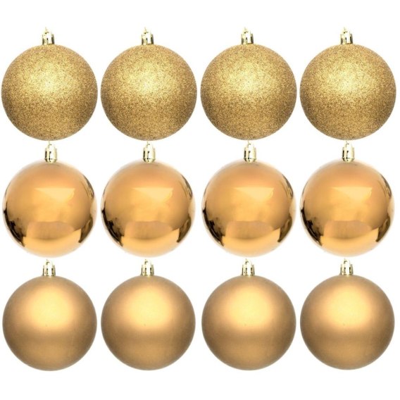 - w zestawie 12 bombek w złotym kolorze o różnych strukturach
