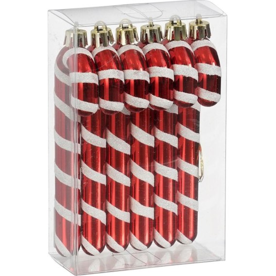 - w komplecie 6 czerwonych bombek w kształcie cukrowych lasek