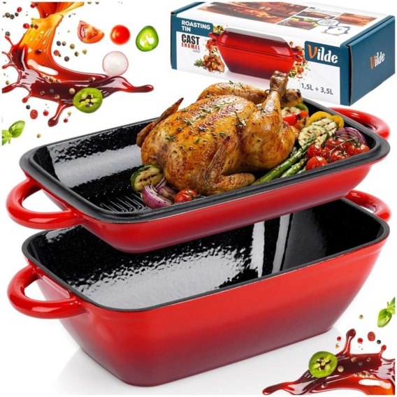 Brytfanna z pokrywką, która służy również jako osobne naczynie znajdzie szerokie zastosowanie w kuchni. Wykonana z wytrzymałych materiałów. W brytfannie przygotujemy różnego rodzaju mięsa, ryby czy warzywa. Zestaw ten jest niezwykle przydatny w każdej kuchni. Brytfanna jest niezwykle solidna i ciężka. Żeliwo rozgrzewa się równomiernie i długo utrzymuje ciepło, dzięki czemu serwowane dania dłużej będą ciepłe. Oryginalny produkt marki Vilde z linii Cast Enamel. Wyprodukowano zgodnie z europejskimi standardami