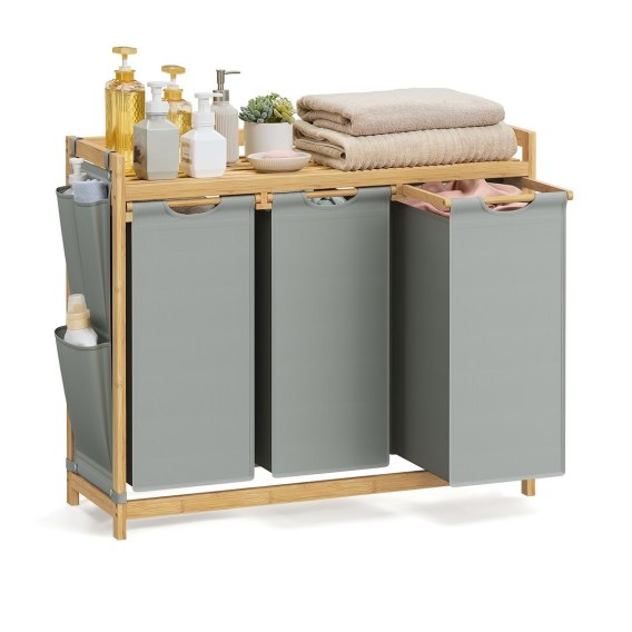 Kosz na pranie o łącznej pojemności 150 litrów, wyposażony w 3 oddzielne przegrody, umożliwia wygodne sortowanie prania według kolorów lub rodzaju tkanin. Każda przegroda ma pojemność 50 L, co pozwala na optymalne zagospodarowanie przestrzeni, ułatwiając organizację ubrań do prania. Kosz posiada górną półkę na detergenty, akcesoria łazienkowe czy kosmetyki. Małe kieszonki boczne zapewniają dodatkową przestrzeń na drobne przedmioty, co pozwala zachować ład i porządek. Pojemnik na pranie wykonany jest z wysokiej jakości bambusa gwarantującą trwałość i stabilność. Półka z osłoną boczną skutecznie zapobiega spadaniu przedmiotów, zapewniając porządek i wygodę użytkowania. Kosze na pranie, wykonane z materiału o wodoodpornych właściwościach, posiadają praktyczną podstawę z tworzywa sztucznego, która zapobiega ich zwisaniu. Dzięki zapięciom na rzepy worki można łatwo wyjąć i przenieść pranie do pralki, co znacznie ułatwia codzienną pracę. Naturalny bambus, z którego wykonano ramę kosza, wprow