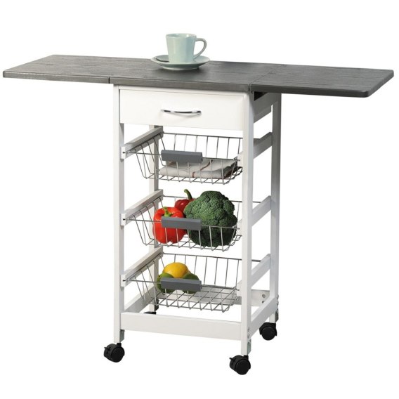 Wózek kuchenny marki Kesper został zaprojektowany tak, aby praca w kuchni była dla Ciebie jeszcze przyjemniejsza. Wyposażony w 4 w pełni ruchome kółka skrętne, dzięki czemu zawsze możesz go przesunąć w odpowiednie miejsce i bezpiecznie ustawić dzięki 2 hamulcom postojowym. To wózek kuchenny, który w prosty sposób może zmienić się w spory stolik z rozkładanym blatem. Dzięki trzem koszom z szufladami, szufladzie i dwóm rozkładanym blatom Twój wózek kuchenny stanie się ulubionym meblem w kuchni. W półkach możesz przechowywać żywność, ręczniki, sztućce itp., a także mieć dużą, dodatkową powierzchnię roboczą, na której można przygotowywać dania.
