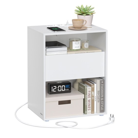 Nowoczesny stolik nocny z wbudowaną listwą zasilającą jest praktycznym rozwiązaniem do każdej sypialni lub salonu. Dzięki 2 portom USB i 2 gniazdom AC ładowanie telefonu, tabletu czy słuchawek staje się niezwykle wygodne - bez potrzeby wstawania z łóżka. Funkcjonalność stolika dopełniają dwie otwarte przegródki, które umożliwiają łatwy dostęp do najpotrzebniejszych przedmiotów, oraz szuflada, idealna do przechowywania rzeczy osobistych i kosztowności, zapewniając dyskrecję i porządek. Minimalistyczny design, czyste linie i matowy biały kolor wprowadzają nowoczesny styl do wnętrza, tworząc jednocześnie przytulną i relaksującą atmosferę. Ten uniwersalny mebel łączy w sobie estetykę z funkcjonalnością, sprawdzając się zarówno w małych, jak i przestronnych pomieszczeniach.