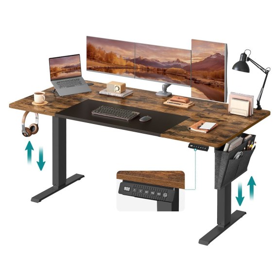 Biurko regulowane elektrycznie 70 × 160 cm z zakresem wysokości 72-120 cm to ergonomiczne biurko idealne do pracy siedzącej i stojącej. Dzięki płynnej regulacji wysokości oraz funkcji pamięci na 4 ustawienia, biurko z regulacją wysokości umożliwia szybkie dopasowanie pozycji, poprawiając komfort i zdrowie podczas wielogodzinnej pracy. Stabilna stalowa rama oraz system ochrony przed wstrząsami zapewniają bezpieczeństwo i trwałość konstrukcji. Biurko do pracy na stojąco zostało wyposażone w praktyczną kieszeń na książki lub dokumenty, montowaną z lewej lub prawej strony, oraz 3 haczyki na torby i słuchawki. Dwa przepusty kablowe pomagają zachować porządek na blacie, sprzyjając lepszej organizacji i koncentracji. Cichy mechanizm podnoszenia, intuicyjny panel sterowania LED oraz ochrona przed przegrzaniem zwiększają wygodę codziennego użytkowania. Szybki i łatwy montaż dzięki oznaczonym częściom i ilustrowanej instrukcji sprawia, że ergonomiczne biurko jest gotowe do pracy.