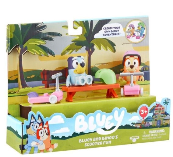 Ostrzeżenia! Nieodpowiednie dla dzieci poniżej 3 lat. Ryzyko zadławienia. Zawiera małe elementy, które mogą zostać połknięte lub wchłonięte. Nie zjadać. Wymagany nadzór osoby dorosłej. Opakowanie należy zachować ze względu na zawarte informacje lub ewentualną reklamację. Przed podaniem zabawki dziecku należy usunąć opakowanie oraz elementy mocujące. Kolory i styl mogą się różnić. Wyprodukowano w Wietnamie. W zestawie: 1 figurka Bluey, 1 figurka Bingo, 2 hulajnogi, 2 kaski, 1 ławka.