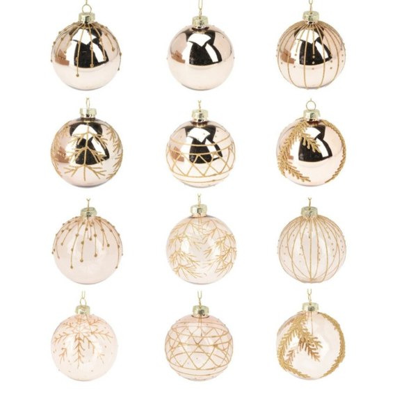 Stylowe szklane bombki w odcieniu złotym to klasyczna ozdoba, która nada choince wyjątkowego charakteru. Dzięki połączeniu lustrzanego, błyszczącego wykończenia oraz złotych brokatowych wzorów prezentują się niezwykle efektownie, pięknie odbijając światło lampek choinkowych.