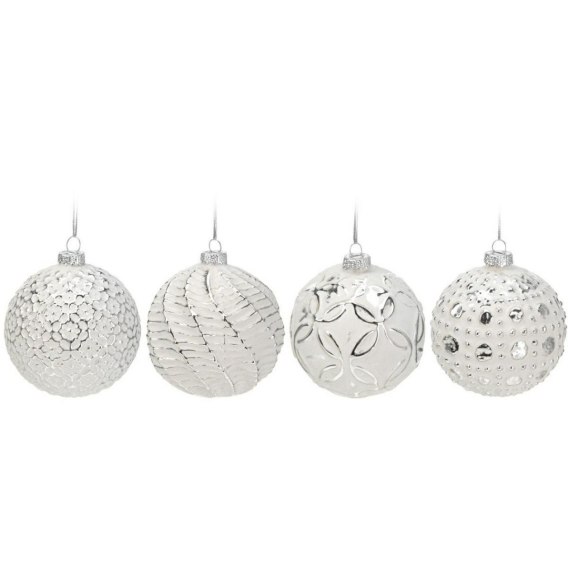 Przepiękny zestaw dwunastu szklanych bombek w czterech różnych wzorach. Każda bombka w kolorze białym posiada wytłoczony srebrny wzór. Zakończona srebrną zawieszką, prezentuje się efektownie i wprowadza domowników w błogi, świąteczny nastrój.