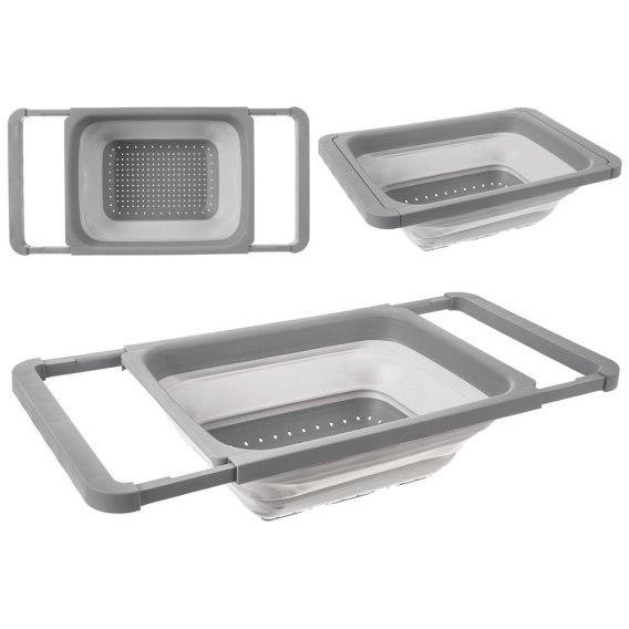Składany cedzak kuchenny z rozsuwanymi uchwytami. Wykonany z tworzywa oraz termoplastycznego silikonu w kolorze szarym. Możemy wygodnie umocować go na zlewie.