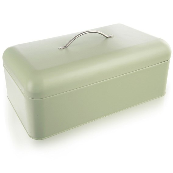 Duży chlebak wykonany z najwyższej jakości metalu w pastelowym, zielonym kolorze. Posiada wygodną pokrywkę na zawiasach, otwieraną za pomocą uchwytu.