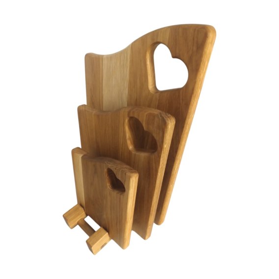 Wyjątkowy Zestaw 3 Desek Dębowych do Krojenia z PodstawkąWprowadź do swojej kuchni odrobinę naturalnego piękna z naszym zestawem trzech desek dębowych do krojenia, uzupełnionym praktyczną podstawką. Te deski są idealnym wyborem dla osób ceniących sobie naturalne materiały i elegancki, minimalistyczny styl.Każda deska została precyzyjnie wykonana z najwyższej jakości drewna dębowego, znanego ze swojej trwałości i odporności na wilgoć. Dodatkowym atutem jest subtelne wycięcie w kształcie serca, które nadaje im unikalnego uroku.Zestaw obejmuje trzy deski o zróżnicowanych rozmiarach, co czyni je niezwykle wszechstronnymi. Od krojenia warzyw po serwowanie przekąsek, te deski spełnią wszystkie Twoje potrzeby kulinarne. Trwałość dębowego drewna zapewnia, że będą one nie tylko praktyczne, ale także piękne przez wiele lat.Podstawka, która jest częścią zestawu, pozwala na eleganckie i wygodne przechowywanie desek, oszczędzając cenne miejsce na blacie. Jest to nie tylko praktyczne rozwiązanie, ale także stylowy dodatek do każdej kuchni, niezależnie od jej wielkości.Najważniejsze Cechy Produktu:✔ Trwałe drewno dębowe - odporne na wilgoć i uszkodzenia✔ Elegancki design - subtelne wycięcie w kształcie serca✔ Trzy różne rozmiary - dostosowane do różnych zadań kuchennych✔ Naturalny wygląd - idealnie pasuje do rustykalnych wnętrz✔ Praktyczna podstawka - ułatwia organizację i przechowywanieTen zestaw jest doskonałym wyborem jako funkcjonalny element wyposażenia kuchni, a także jako elegancki prezent dla bliskiej osoby.Wymiary Zestawu:Deska Duża Długość (od strony serca): 43 cm Długość (w krótszym miejscu): 35 cm Szerokość: 28 cm Grubość: 2 cmDeska Średnia Długość (od strony serca): 33 cm Długość (w krótszym miejscu): 27 cm Szerokość: 24 cm Grubość: 2 cmDeska Mała Długość (od strony serca): 24 cm Długość (w krótszym miejscu): 20 cm Szerokość: 19 cm Grubość: 2 cmPodstawka Długość: 20 cm Szerokość: 12 cmWaga zestawu: 3,5 kg