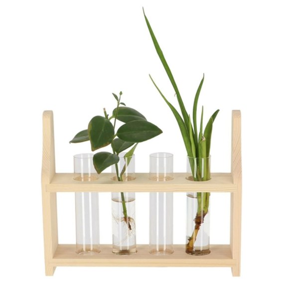 Stylowy stojak z naturalnego drewna wyposażony w 4 szklane probówki oraz szczoteczkę do ich czyszczenia. Idealny jako element dekoracyjny do wnętrz w stylu boho, skandynawskim czyminimalistycznym. Doskonale sprawdzi się do ekspozycji ciętych kwiatów, ukorzeniania roślin oraz tworzenia roślinnych kompozycji.