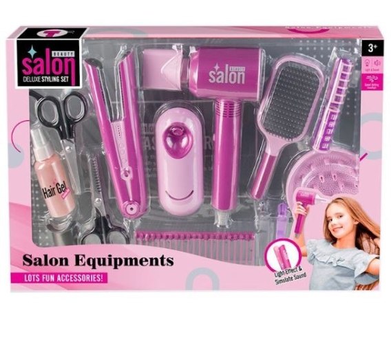Zestaw składa się z suszarki z dwoma wymiennymi końcówkami i prostownicy na baterie, szczotki, grzebienia, 2 wałków, 2 spinek, 2 par nożyczek oraz plastikowej buteleczki.