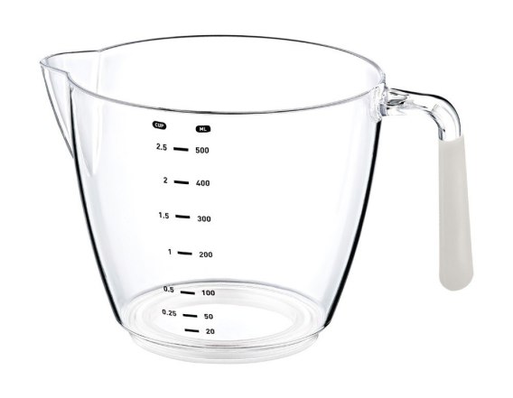 Przezroczysty dzbanek z miarką to niezastąpione narzędzie w każdej kuchni. Pojemnik wyposażony jest w wyraźne oznaczenia zarówno w mililitrach (ML), jak i kubkach (CUP), umożliwiając dokładne odmierzanie ilości od 20 ml do 500 ml, co sprawia, że jest to idealne narzędzie do gotowania, pieczenia oraz przygotowywania napojów. Dzbanek posiada wygodny uchwyt z antypoślizgowego materiału z jasnobeżowym wykończeniem, co zwiększa komfort użytkowania i pewność trzymania. Dzięki dzióbkowi do wylewania można łatwo i precyzyjnie przelewać płyny, minimalizując ryzyko rozlania. Dodatkowym atutem jest gumowa podkładka umieszczona na spodzie dzbanka, która zapewnia stabilność i zapobiega przesuwaniu się po blacie. Wykonany z wytrzymałego, odpornego na uszkodzenia materiału, dzbanek ten to niezastąpione akcesorium kuchenne do codziennego użytku.