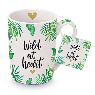 Kubek porcelanowych o pojemności 350 ml, przedstawiający tropikalne liście i stylizowany napis: „Wild at heart". Wykonany z porcelany charakteryzującej się wyjątkową elegancją i wytrzymałością. Poręczne ucho gwarantuje stabilny uchwyt podczas picia. Idealnie sprawdzi się do serwowania kawy, herbaty, gorącej czekolady i naparów ziołowych.
