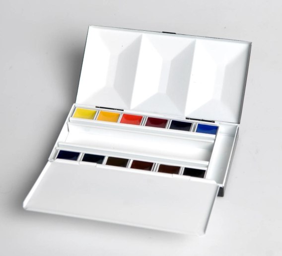 Farby akwarelowe BLOCKX w półkostkach w emaliowanym stalowym pudełku, zabezpieczone woreczkiem.