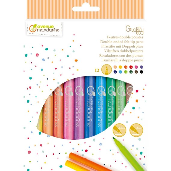 12 flamastrów dwustronnych w kolorach: brzoskwiniowym, żółtym, pomarańczowym, czerwonym, różowym, fioletowym, ciemnoniebieskim, jasnoniebieskim, jasnozielonym, ciemnozielonym, brązowym i czarnym.