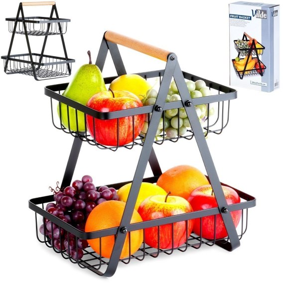Koszyk dwupoziomowy na owoce i warzywa o wymiarach 27 x 17,5 x 29 cm. Koszyk dolny ma wymiary 27 x 17 x 6 cm, koszyk górny ma wymiary 21 x 17 x 6 cm. Dzięki niemu w piękny sposób wyeksponujesz owoce i warzywa na stole. Może służyć również do przechowywania drobnych przedmiotów. Do pomieszczeń klasycznych wniesie nutę teraźniejszych trendów. Jest stabilny, praktyczny i poręczny, wyposażony w wygodny uchwyt, który ułatwi przenoszenie. Idealny do każdej kuchni oraz jadalni. Oryginalny produkt marki Vilde. Wyprodukowano zgodnie z europejskimi standardami.
