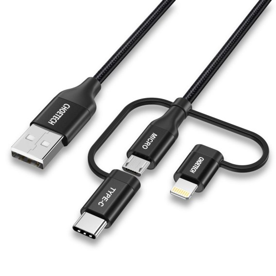 Choetech 3w1 kabel USB MFI Lightning / USB Typ C / micro USB (ładowanie 3A / przesyłanie danych 480 Mbps) 1,2 m czarny (IP0030-BK) Kabel USB z 3 wtyczkami: USB Typ C, micro USB oraz Lightning. Pojedynczy przewód, który pozwala naładować każdy sprzęt wyposażony we wspomniane złącza oraz przesłać dane np. do i z komputera na telefon. Idealny dla osób posiadających kilka urządzeń różnych producentów. Jeden dla wszystkich