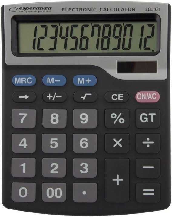 Kalkulator biurkowy z dużym, 12 cyfrowym wyświetlaczem. Posiada wszystkie podstawowe funkcje matematyczne (dodawanie, odejmowanie, mnożenie, dzielenie, pierwiastkowanie, obliczanie procentów.