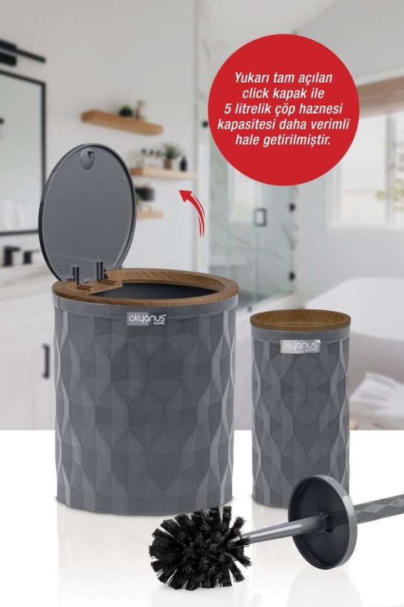 Zestaw Diamond to niezastąpione rozwiązanie dla tych, którzy dbają o estetykę i funkcjonalność w swojej przestrzeni łazienkowej. W skład zestawu wchodzi kosz na śmieci oraz szczotka do toalety, oba w eleganckim połączeniu szarego koloru z wykończeniem w kolorze drewna. Kosz na śmieci nie tylko zapewnia praktyczne przechowywanie odpadków, ale także doskonale komponuje się z innymi elementami wystroju łazienki. Jego minimalistyczny design i kolorystyka sprawiają, że idealnie pasuje do różnych aranżacji wnętrz, dodając im świeżości i czystości. Drewniane wykończenie dodaje mu subtelnej elegancji, podkreślając jego wysoką jakość wykonania. Szczotka do toalety, która również znajduje się w zestawie, jest nie tylko praktycznym narzędziem do utrzymania czystości w łazience, ale także estetycznym elementem dekoracyjnym. Jej uchwyt idealnie harmonizuje z koszem na śmieci, tworząc spójną całość. Drewniane wykończenie dodaje jej elegancji i sprawia, że jest prawdziwą ozdobą łazienki.