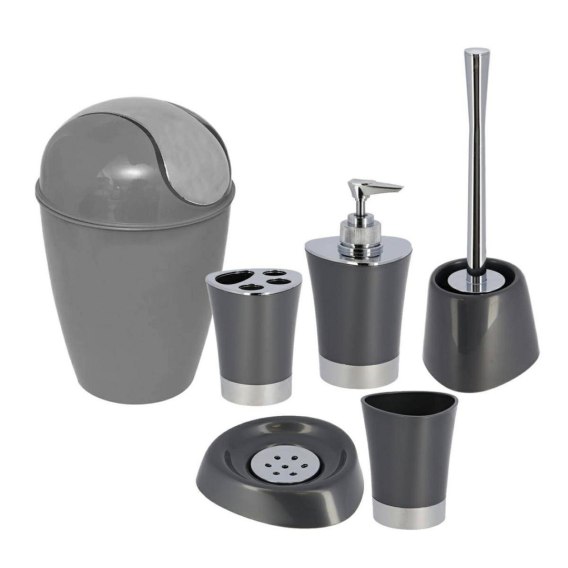 plastikowy szary zestaw łazienkowy kosz dozownik szczotka wc kubek na przybory mydelniczka srebrny