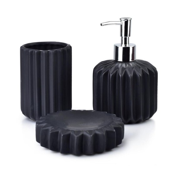 Ceramiczny komplet łazienkowy w kolorze czarnym składający się z dozownika do mydła, kubka i mydelniczki. Charakterystyczne żłobienia na całej powierzchni poszczególnych elementów zestawu stanowią stylowy akcent dekoracyjny. Praktyczny oraz elegancko wyglądający dodatek do łazienki.