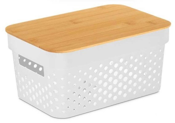 Kosz firmy Kinvara to elegancki i praktyczny organizer do przechowywania różnych domowych drobiazgów. Wykonany z lekkiego, ale trwałego tworzywa z perforowanymi ściankami, zapewnia odpowiednią wentylację - idealny do przechowywania pieczywa, warzyw, kosmetyków czy akcesoriów. Naturalna bambusowa pokrywka dodaje stylu i może pełnić funkcję tacy lub dodatkowej powierzchni użytkowej. Koszyk świetnie sprawdzi się w kuchni, łazience, garderobie i biurze. Dzięki neutralnej kolorystyce pasuje do każdego wnętrza, a ergonomiczne uchwyty ułatwiają przenoszenie.