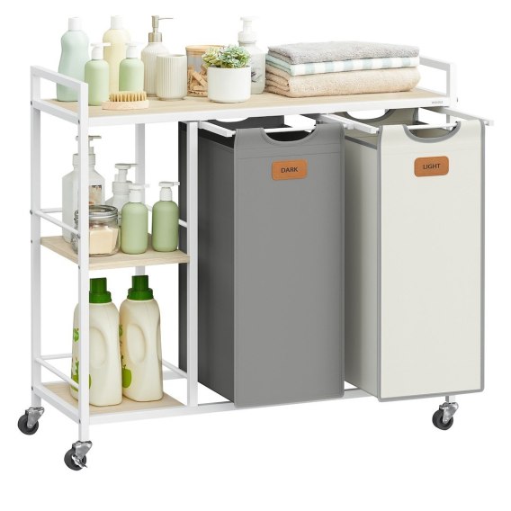 Kosz na pranie z 2 przegrodami jest doskonałym sposobem na uporządkowanie prania, oferujący pojemność 100 L Dwa kosze po 50 L w różnych kolorach oraz 6 etykiet (w języku angielskim) ułatwiają sortowanie prania według potrzeb. Etykiety można łatwo przymocować za pomocą rzepów, zapewniając porządek i wygodę. 3 półki umożliwiają przechowywanie detergentów, worków na pranie i innych niezbędnych akcesoriów, tworząc dodatkowe miejsce na najpotrzebniejsze przedmioty. Wózek wyposażony w 4 kółka, z których 2 mają hamulce, jest łatwy do przesuwania i stabilizacji w wybranym miejscu. Wkłady wykonane z wodoodpornej tkaniny Oxford są wytrzymałe, a dzięki zapięciom na rzepy i wygodnym uchwytom można je łatwo zdejmować i transportować. Solidna konstrukcja oparta na stalowych rurach o przekroju 1,5 x 1,5 cm oraz wysokiej jakości płyt MDF zapewniają trwałość i estetykę. Opcja zamontowania 4 regulowanych nóżek zamiast kółek pozwala na dodatkową stabilność i bezpieczeństwo w wybranym miejscu.