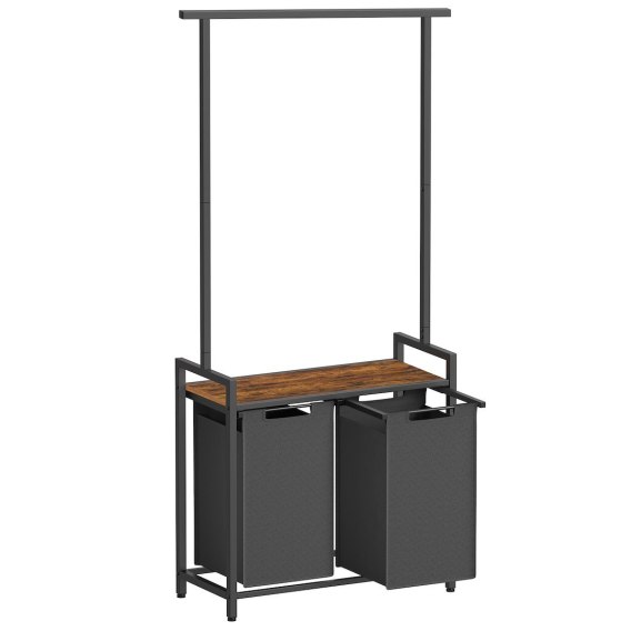 Kosz do segregacji prania, z 2 wyjmującymi komorami (2 x 46 L)i wieszakiem na ubrania, w rustykalnej kolorystyce charakteryzuje się solidnym i szczegółowym wykonaniem. Idealny mebel dla osób ceniących oszczędność przestrzeni, a zarazem ceni eleganckie rozwiązanie. Ze względu na uniwersalny design kosz na pranie wpasuje się zarówno w klasyczne, jak i bardziej nowoczesne aranżacje, wzbogacając wnętrze oraz dodając mu oryginalności. Do jego produkcji wykorzystano materiały najwyższej jakości z płyty wiórowej stali i słynnej tkaniny Oxford, która charakteryzuje się wodoodpornością, wytrzymałością na otarcia oraz rozciąganie się, dzięki czemu jest to doskonała propozycja dla wszystkich poszukujących trwałych i odpornych mebli, które służyć będą przez wiele długich lat. Doskonale sprawdzi się w łazience lub pralni dla rodzin jak i pojedynczych osób.