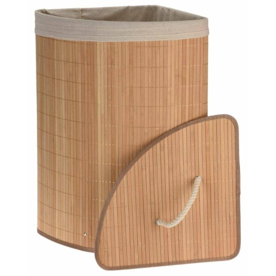 Praktyczny i funkcjonalny narożny kosz łazienkowy na brudną bieliznę. Pojemnik wykonany z bambusa z uchwytami do przenoszenia oraz wkładem bawełnianym. Kosz jest składany oraz zamykany od góry. Idealnie sprawdzi się w roli organizera łazienkowego czy też jako kufer na zabawki.