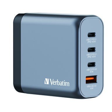 Ładowarka ścienna Verbatim GNC-140 GaN 32203 to wielofunkcyjne urządzenie o mocy 140 W, które oferuje cztery porty: dwa porty USB-C PD 140 W, jeden port USB-C PD 20 W oraz jeden port USB-A QC 3.0, zamknięte w kompaktowej i eleganckiej obudowie. Doskonale sprawdzi się zarówno w biurze, jak i w domu, a także podczas podróży, umożliwiając jednoczesne zasilanie laptopów, tabletów, smartfonów, urządzeń gamingowych i wielu innych urządzeń.