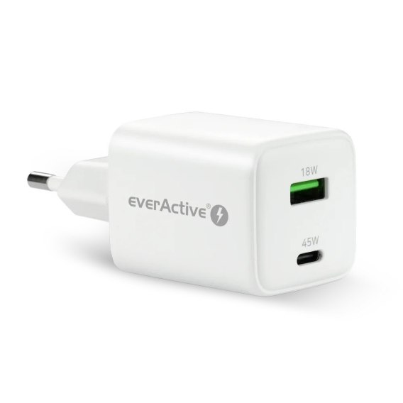 Ładowarka sieciowa everActive GaN SC-450Q z gniazdem USB oraz USB-C PD PPS QC4+ 45W