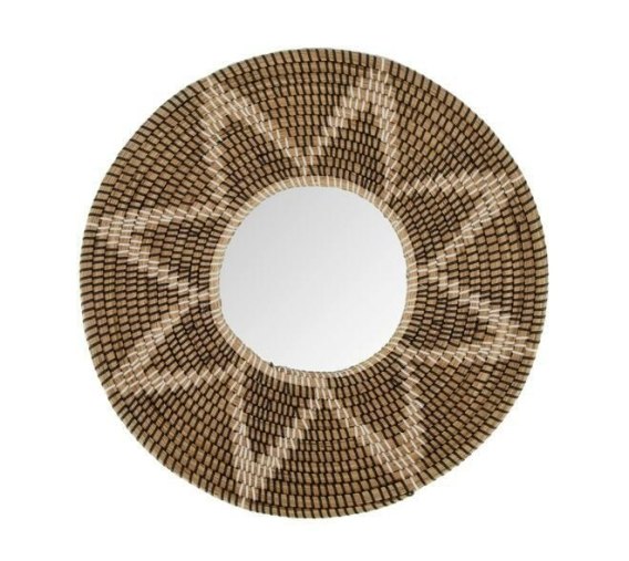 Dekoracyjne lustro w okrągłej ramie z plecionej trawy morskiej to harmonijne połączenie natury, rzemiosła i stylu etno. Wzór przypominający promienistą gwiazdę nadaje całości oryginalny charakter i przyciąga wzrok, tworząc ciepły, przytulny klimat w każdym wnętrzu. Lustro doskonale sprawdzi się w salonie, przedpokoju, sypialni czy nad komodą. Trawa morska to materiał ekologiczny i trwały, który idealnie wpisuje się w trend naturalnych wnętrz - boho, skandynawskich i rustykalnych. Wiszące lustro pięknie odbija światło i optycznie powiększa pomieszczenie nadając mu wyrazistego charakteru.