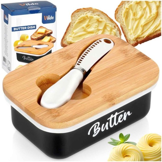 - Modny design - Wykonana z najwyższej jakości metalu w czarnym kolorze z białym napisem Butter. Prezentuje się bardzo elegancko, dzięki bambusowej pokrywce. Maselniczka posiada klasyczny kształt, więc będzie pasowała do wyposażenia każdej kuchni, a postawiona na stole pasuje do każdej zastawy. Utrzymana w modnym kolorze.