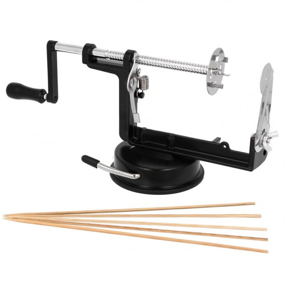 Ręczna maszynka do krojenia ziemniaków na zakręcone chipsy. Niezwykle prosta w obsłudze. W minutę uzyskamy zakręconą frytkę, która smażona przez 3-4 minuty w gorącym oleju zamieni się w pysznego chipsa na patyku. Można posypać różnymi przyprawami zależnie od upodobań.