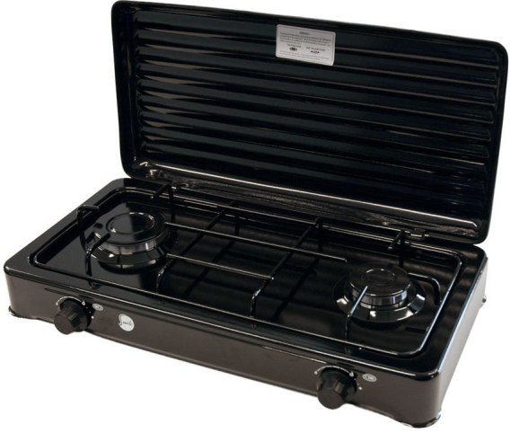 Wolnostojąca kuchenka gazowa o szerokości 57 cm, sterowana mechanicznie, z 2 palnikami o mocy całkowitej 4300 W, metalową pokrywą oraz z pojedynczym rusztem emaliowanym.