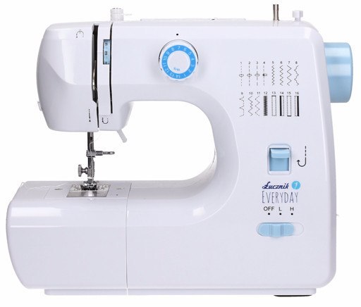 Maszyna do szycia z oświetleniem LED. Zastosowanie: reperacje, przyszywanie aplikacji, obszywanie dziurki guzika. Zatrzaskowe mocowanie stopek. Wysokie podnoszenie. Chwytacz rotacyjny. Szycie wstecz. Wolne ramię. Schowek na akcesoria.
