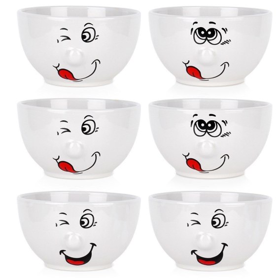 Zestaw sześciu miseczek z uroczymi buźkami. Przydatne miseczki do serwowania zup. Wykorzystamy je również do podawania płatków śniadaniowych, surówek oraz przekąsek. Niezwykle uniwersalne zastosowanie sprawi, że będą często używane. Przydatne w każdym domu, zarówno podczas codziennych spotkań, jak i wyjątkowych okazji. Łatwe w czyszczeniu i użytkowaniu. Prosty i klasyczny kształt sprawia, że efektownie prezentują się na stole. Oryginalny produkt holenderskiej marki Siaki Collection. Wyprodukowano zgodnie z europejskimi standardami.
