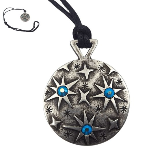 Naszyjnik Gwiazdy EST 34 to elegancki dodatek o srebrzystym wykończeniu zdobiony delikatnymi symbolami gwiazd oraz trzema czeskimi kryształami w odcieniu głębokiego granatu. Wisiorek wykonano z wysokiej jakości stopu Zamak, pokrytego warstwą srebra o grubości 8 mikronów. Dzięki regulowanemu, bawełnianemu sznurkowi produkt dopasowuje się do różnych stylizacji, zachowując komfort i trwałość.