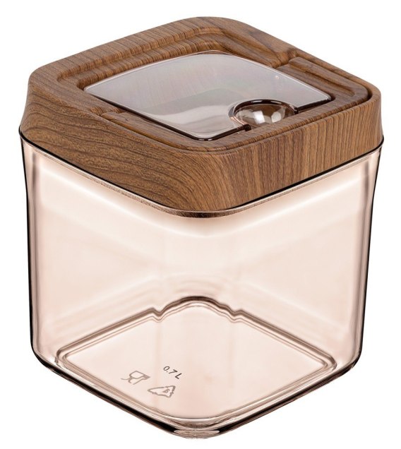 Nowoczesny pojemnik na żywność z pokrywką w kolorze drewna, to idealne rozwiązanie do przechowywania w Twojej kuchni. Wykonany z wysokiej jakości materiału pojemnik został zaprojektowany tak, aby zapewnić świeżość i porządek. Przezroczysta obudowa pozwala łatwo zidentyfikować zawartość, dzięki czemu szybko znajdziesz to, czego potrzebujesz. Dopasowana pokrywa z uszczelką zapobiega przeciekaniu oraz zapewnia szczelne i higieniczne zamknięcie, chroniąc żywność przed wilgocią i szkodnikami. Wystarczy opuścić uchwyt na pokrywie, aby zapewnić optymalne warunki przechowywania żywności. Pojemnik można ułożyć jeden na drugim, co oszczędzi miejsca w spiżarni lub lodówce. Jest łatwy w czyszczeniu, co czyni go wygodnym wyborem w codziennym użytkowaniu. Nie zawiera BPA.
