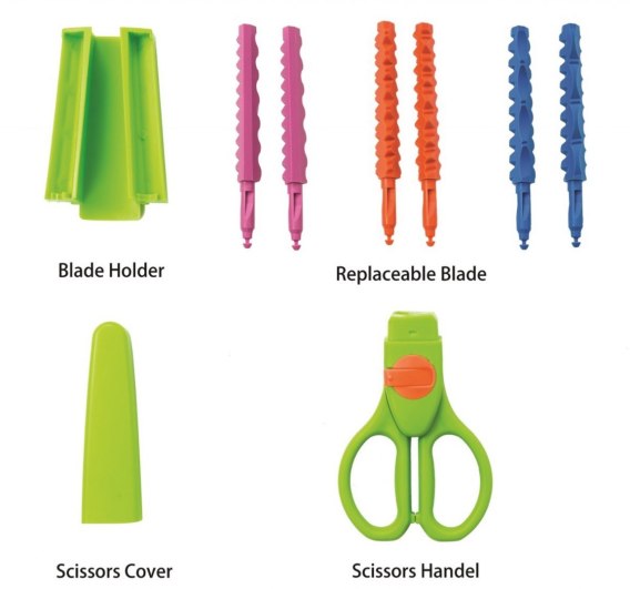 Zestaw posiada 3 pary ostrzy, każde z 3 różnymi kształtami na ściankach. 1 nożyczki wycinają w 9 różnych wzroków. Z łatwością można wymieniać ostrza, a każde wystarczy obrócić żeby zmienić jeden z wzroków do wycinania na inny.