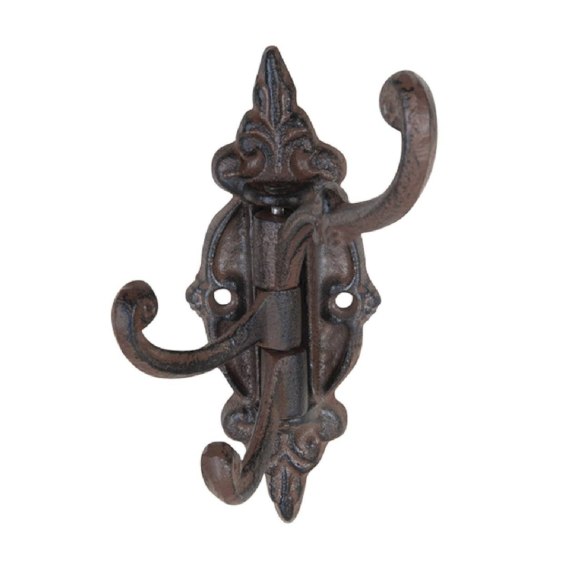 Stylowy wieszak ścienny wykonany z żeliwa to praktyczna i elegancka ozdoba przedpokoju, łazienki lub ogrodu. Trzy haczyki o różnej długości można obracać, co pozwala na elastyczne wieszanie różnych przedmiotów.