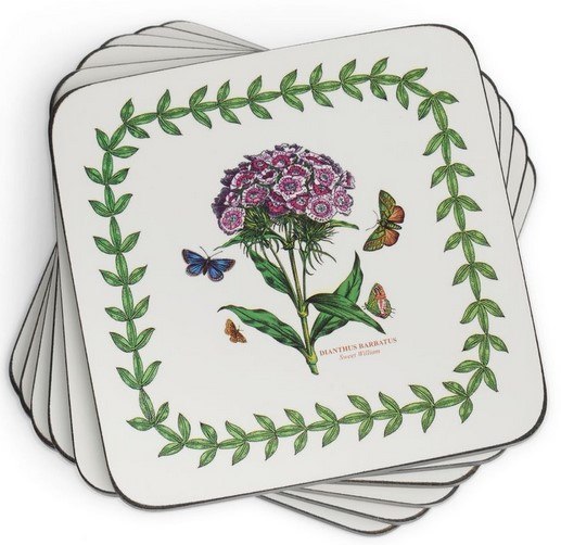 Zestaw sześciu wspaniałych i praktycznych podkładek korkowych, ozdobionych pięknym kwiatem i fruwającymi motylkami w ramce z listków z kolekcji Botanic Garden.