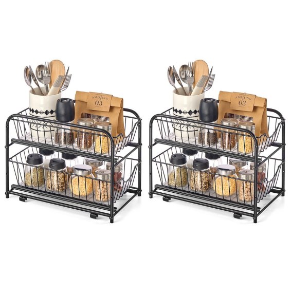 Zestaw 2 organizerów kuchennych z wysuwanymi szufladami to praktyczne i stylowe rozwiązanie do przechowywania przypraw, akcesoriów, kosmetyków i drobiazgów. Każdy regał posiada 2 poziomy z regulowaną wysokością koszyków, co pozwala dopasować je do zawartości i wielkości przechowywanych produktów. Antypoślizgowe podkładki z tworzywa chronią przed spadaniem drobnych przedmiotów i ułatwiają czyszczenie. Konstrukcja z malowanej proszkowo stali jest trwała i odporna na rdzę, a kompaktowy format sprawdzi się zarówno w kuchni, jak i w łazience czy szafce pod zlewem. Idealne do oszczędzania miejsca i utrzymania porządku.