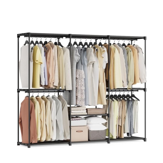 Praktyczna modułowa szafa wolnostojąca zapewnia aż 5 przestronnych stref z drążkami - w tym 4 krótsze (78,7 cm) i 1 dłuższą (118,7 cm) - umożliwiając przechowywanie różnych rodzajów odzieży: od koszul i spodni po płaszcze i sukienki. Dodatkowe półki idealnie nadają się na złożone ubrania, pościel, pudełka z akcesoriami czy buty, pomagając utrzymać porządek w sypialni, garderobie, pralni lub przedpokoju. Solidna konstrukcja oparta na wzmocnionych rurach stalowych i trwałych złączkach z tworzywa sztucznego zapewnia wysoką stabilność. Każda półka materiałowa wytrzymuje do 10 kg, a drążki do 15 kg, co czyni szafę wytrzymałą i gotową na codzienne użytkowanie. Nowoczesny wygląd i uniwersalna forma w kolorze atramentowej czerni pozwalają łatwo wkomponować mebel w dowolne wnętrze - od minimalistycznych po bardziej klasyczne. Dodatkowe zabezpieczenie przed przewróceniem zapewnia bezpieczeństwo użytkowania, szczególnie w domach z dziećmi lub zwierzętami.