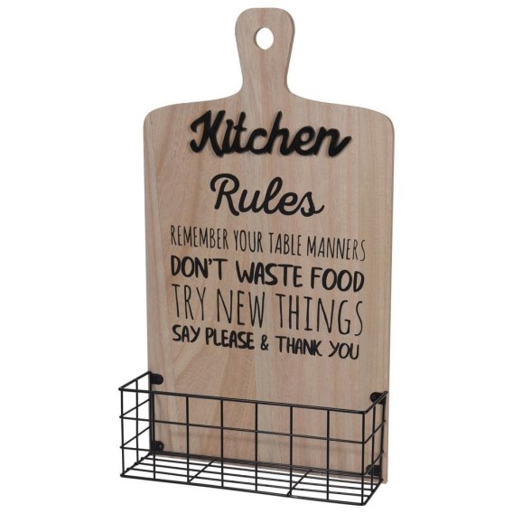 Wisząca półka kuchenna w formie koszyka. Posiada kształt deski do krojenia. Świetnie sprawdzi się na przyprawy, przybory kuchenne oraz inne drobiazgi.