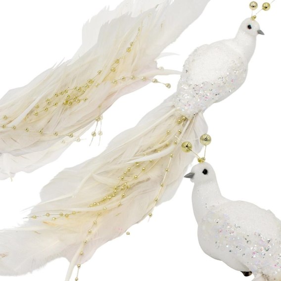 PTASZEK DEKORACYJNY NA KLIPSIE 38CM BIAŁO ZŁOTY to ozdoba, która łączy w sobie luksusowy wygląd z prostotą montażu. Dzięki klipsowi możesz przypiąć go w dowolnym miejscu - na gałązce, zasłonie, świeczniku czy wieńcu. Naturalne pióra i subtelne kolory sprawiają, że dekoracja wprowadza do wnętrza lekkość, elegancję i odrobinę świątecznego blasku.