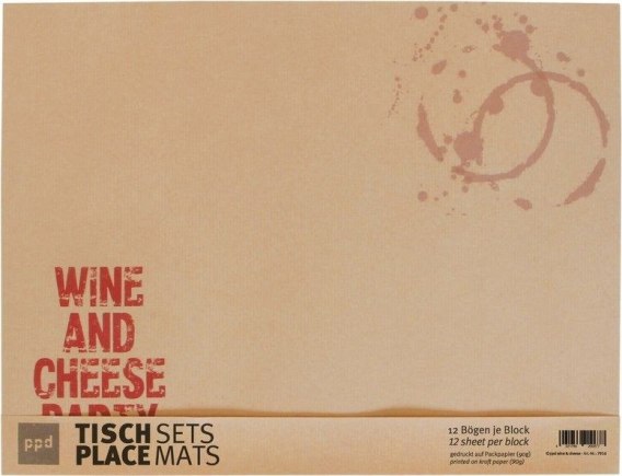 Komplet papierowych podkładek na stół zdobionych napisem: „Wine and Cheese Party" (Impreza z winem i serem). Nie wyciągaj obrusu na spotkanie z przyjaciółmi. Wystarczą podkładki, które po posiłku po prostu wyrzucisz i stół posprzątany.