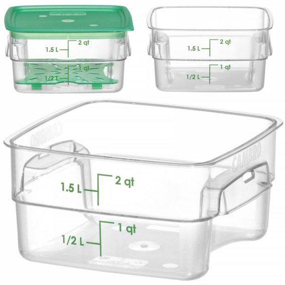 Pojemnik na żywność CamSquaresreg; Fresh Pro firmy Cambro to wielorazowe i przyjazne środowisku rozwiązanie pozwalające na wydłużenie czasu przydatności żywności. Nadaje się do mokrych i suchych produktów. Jest idealny do przechowywania ziół i przypraw, warzyw, mięs, owoców morza czy płynów. Wykonanie z poliwęglanu, materiału odpornego na odbarwianie się, kwasy spożywcze i zapachy, sprawia, że pojemnik jest niezwykle wytrzymały i tym samym doskonale się sprawdzi w profesjonalnych kuchniach. Teksturowana powierzchnia z boku, zaokrąglone rogi i ergonomiczne uchwyty zwiększają wygodę użytkowania. Pokrywki są sprzedawane oddzielne.